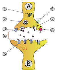 Transmission chimique du neurone A (émetteur) au neurone B (récepteur)